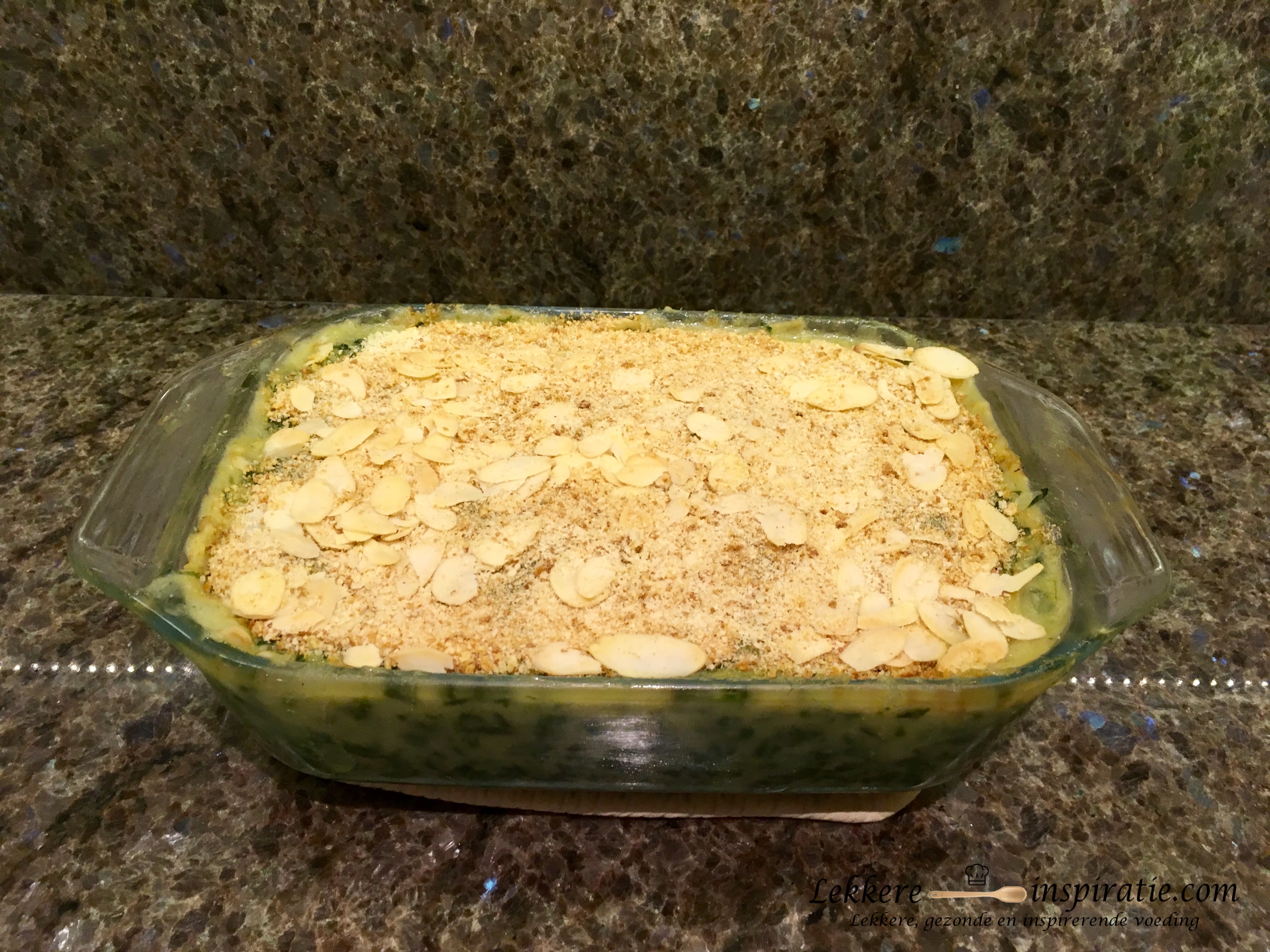 - Voor het korstje gebruik ik paneermeel met daarbij een beetje amandelmeel en amandelschilfers. Maar je kan het ook bestrooien met geraspte kaas (of plantaardig alternatief) of een combinatie van de verschillende opties.