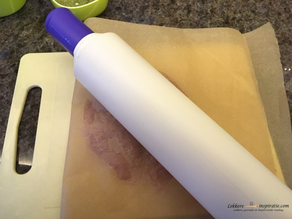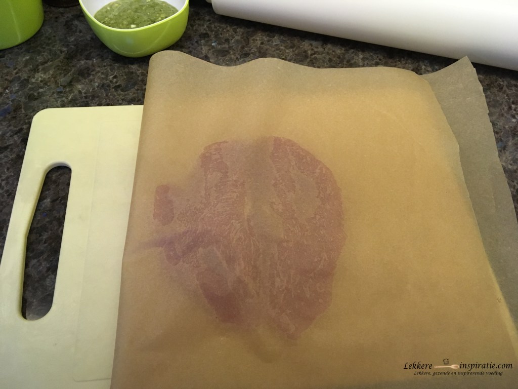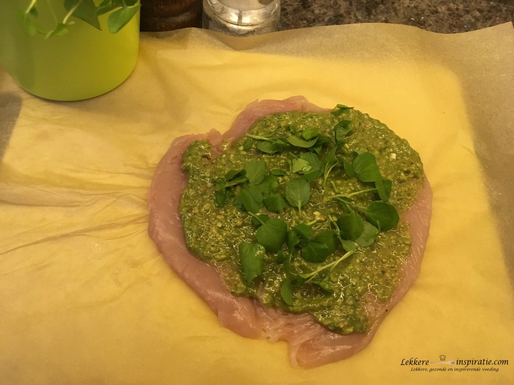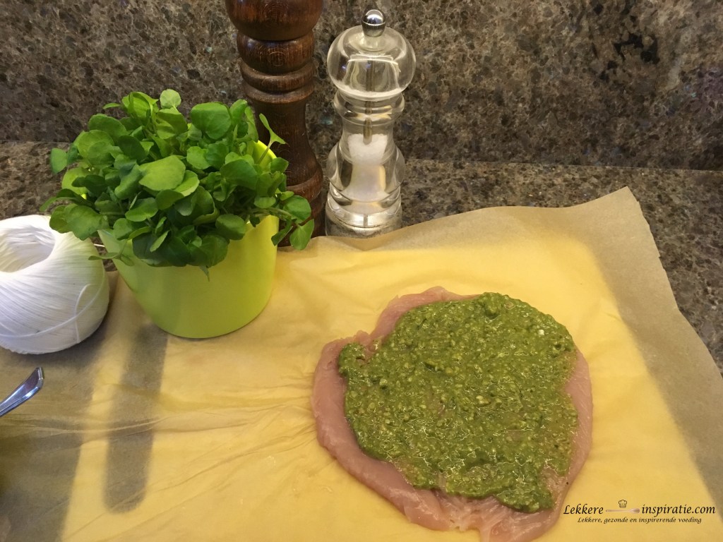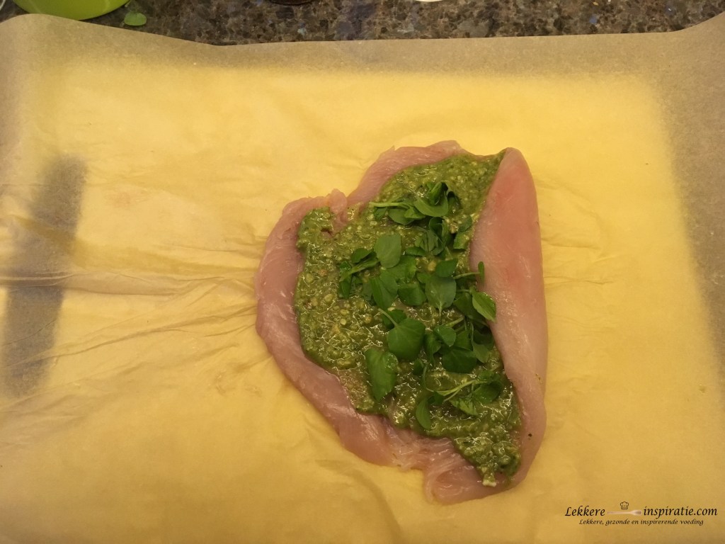 - Stap 4: plooi het bakpapier of plasticfolie terug open en kruid de kip naar smaak (let op de pesto kan redelijk zout zijn).