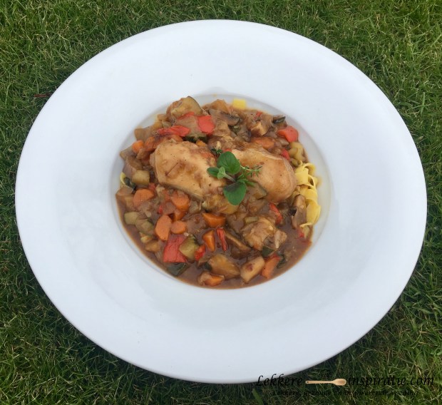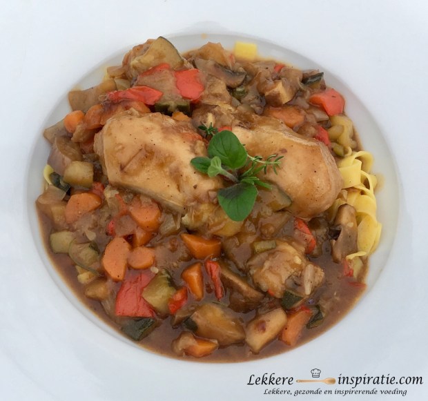 Dit gerecht zit boordevol smaak en groenten. Ik combineer het met kippendrumsticks maar je zou deze ook kunnen weglaten of vervangen door bijvoorbeeld een vegetarisch alternatief (zie tips en tricks). Klik onder de foto voor o.a. het recept.