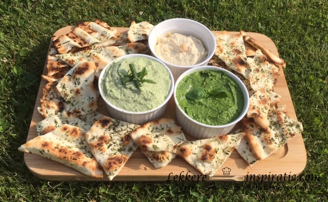 Varieer met de dips naar smaak, kies bv. voor groentespreads, pesto’s, humus,….Je kan de dips zelf maken, kant-en-klaar kopen en/of kant-en-klare varianten pimpen naar smaak.