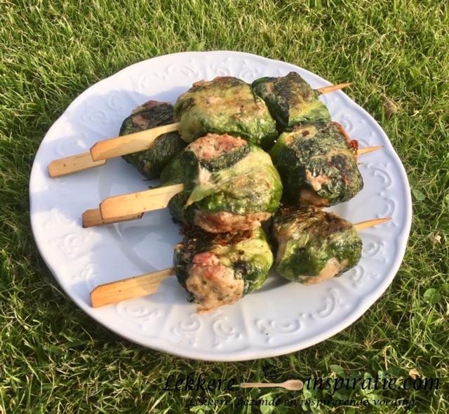 - Prik 2 koolrolletjes op een spies / saté-stok. Zet min. 15 minuten in de koelkast zodat het gehakt goed stevig is.