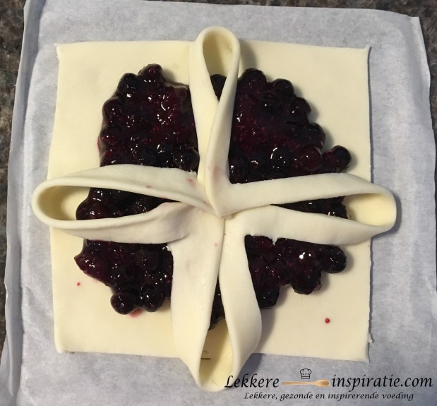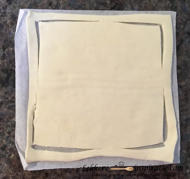 - Snijd de bladerdeeg in zoals weergegeven op de foto. Snijd de hoeken en de zijkanten los maar laat aan elke kant het midden heel zodat het nog aan elkaar hangt.