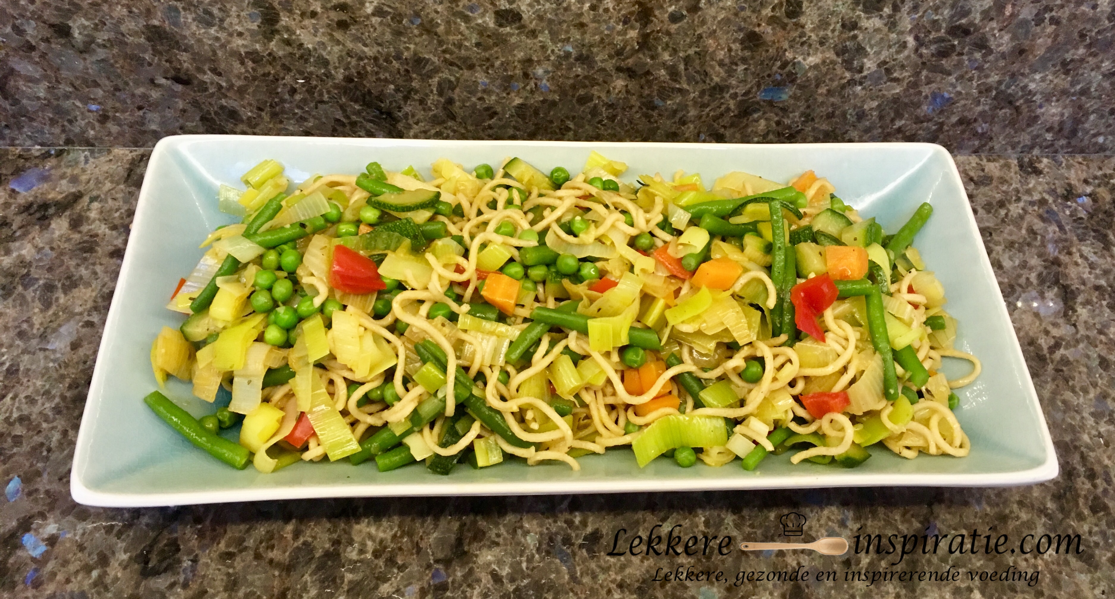 - Voeg de noedels toe en roerbak ± 2 minuten. Proef en kruid naar smaak. Werk eventueel af met lente-ui, sesamzaad, gehakte noten,….