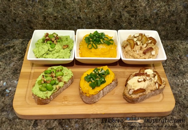 Hieronder vind je drie recepten voor lekker plantaardig beleg (pompoen & wortel, courgette & edamame-boontjes en dadel & amandel) dat je makkelijke zelf kan maken. Nog een pluspunt is dat je ze kan invriezen in porties en zo heb je het altijd in huis. Bij elke spread vind je ook een heerlijke topping maar het kan ook zonder.