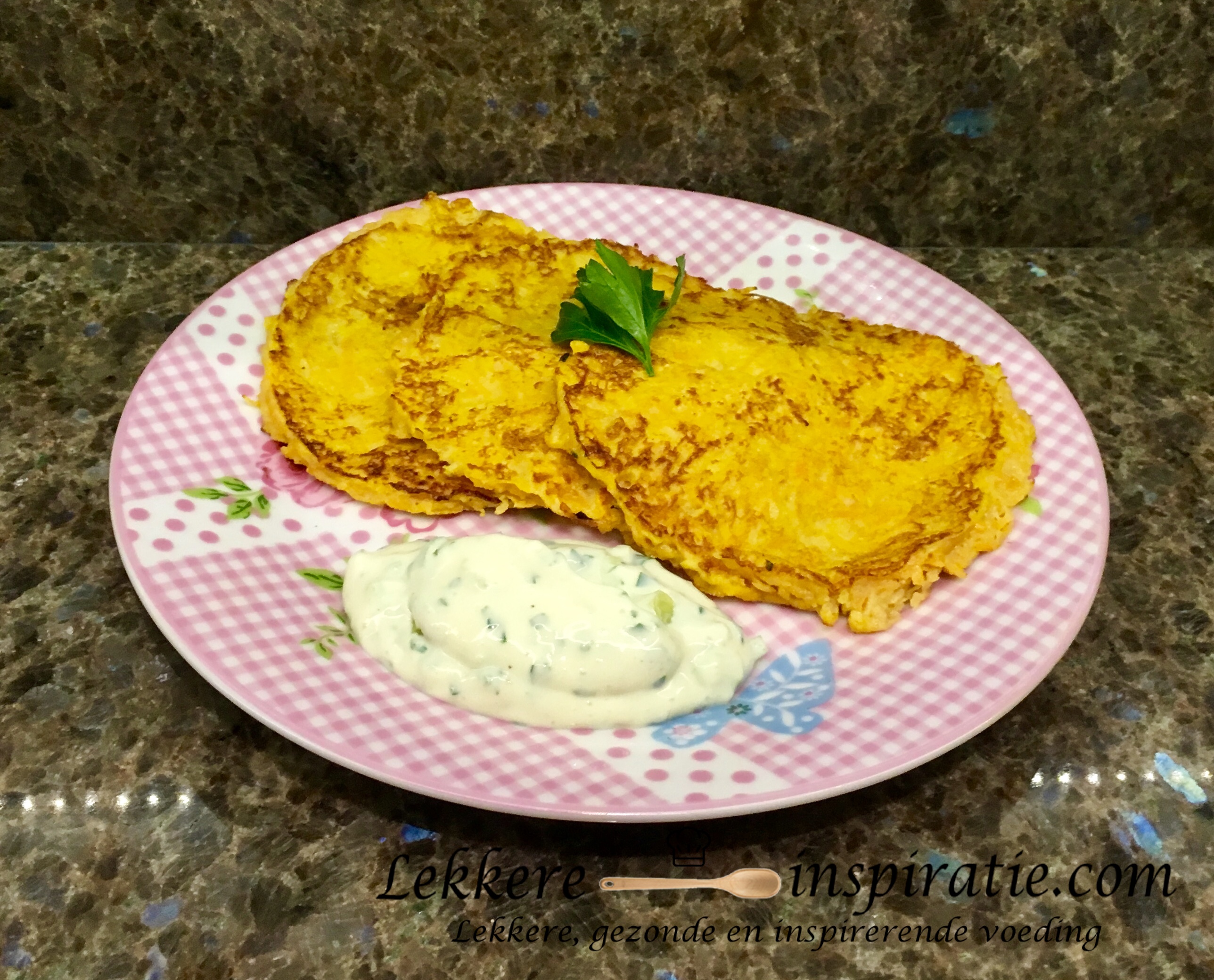 - Serveer de groentepannenkoekjes met de dipsaus.