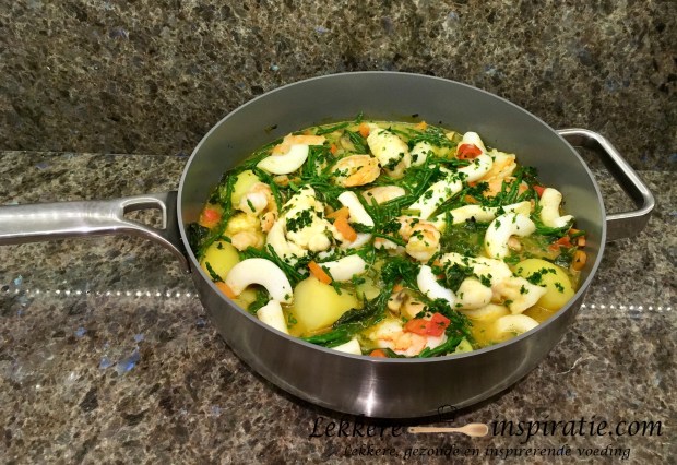 Dit gerecht is niet moeilijk om te maken en zit boordevol smaak. Ik heb het gemaakt met lotte/zeeduivel, inktvis en scampi’s. Maar je kan variëren met vis en zeevruchten naar smaak en seizoen. Klik onder de foto voor o.a. het recept…