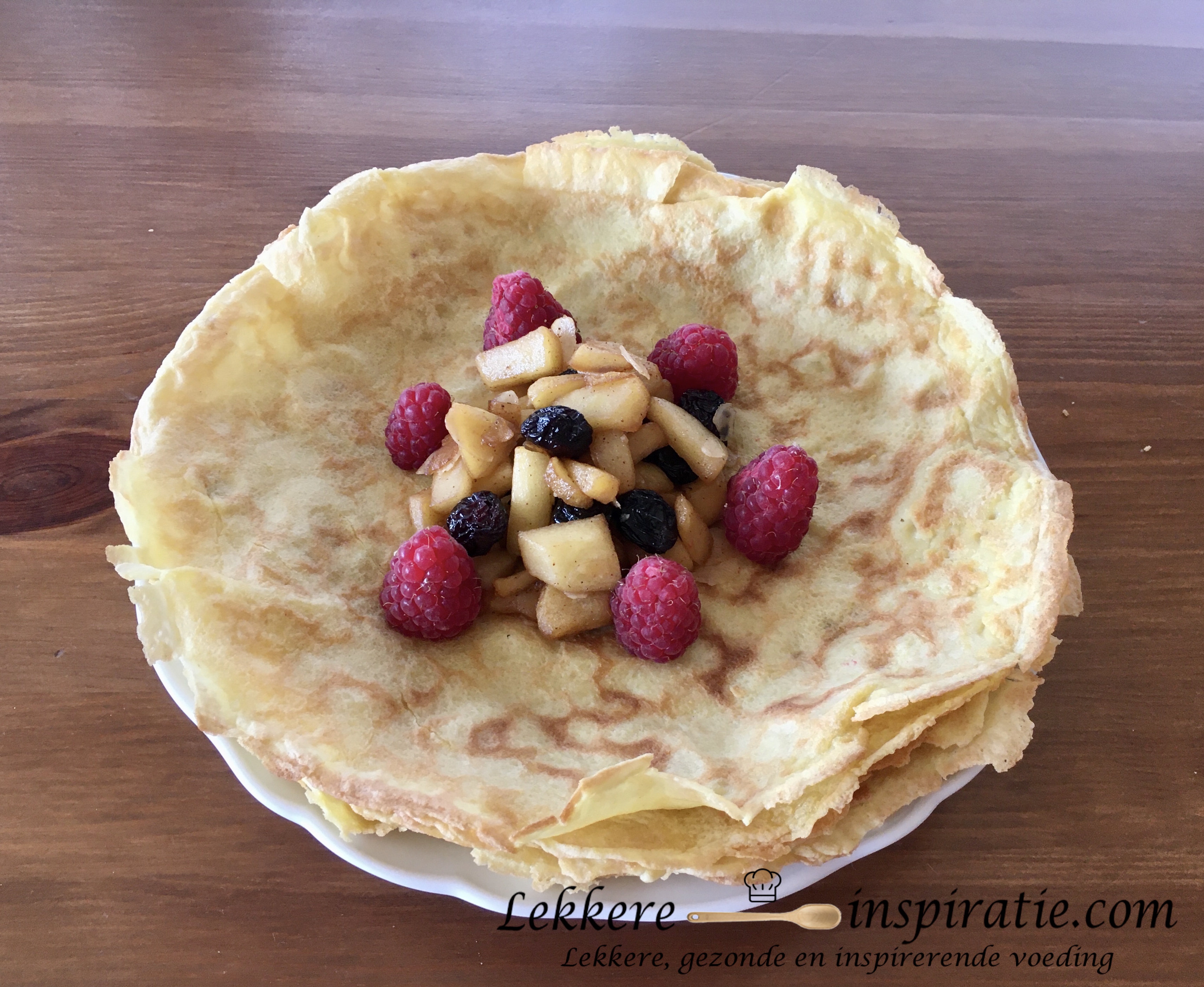 Pannenkoeken zijn een klassieker en een favoriet van vele. Ik combineer de pannenkoeken met gebakken appeltjes en frambozen. Je kan variëren met de toppings naar eigen smaak. Klik onder de foto voor o.a. het recept…