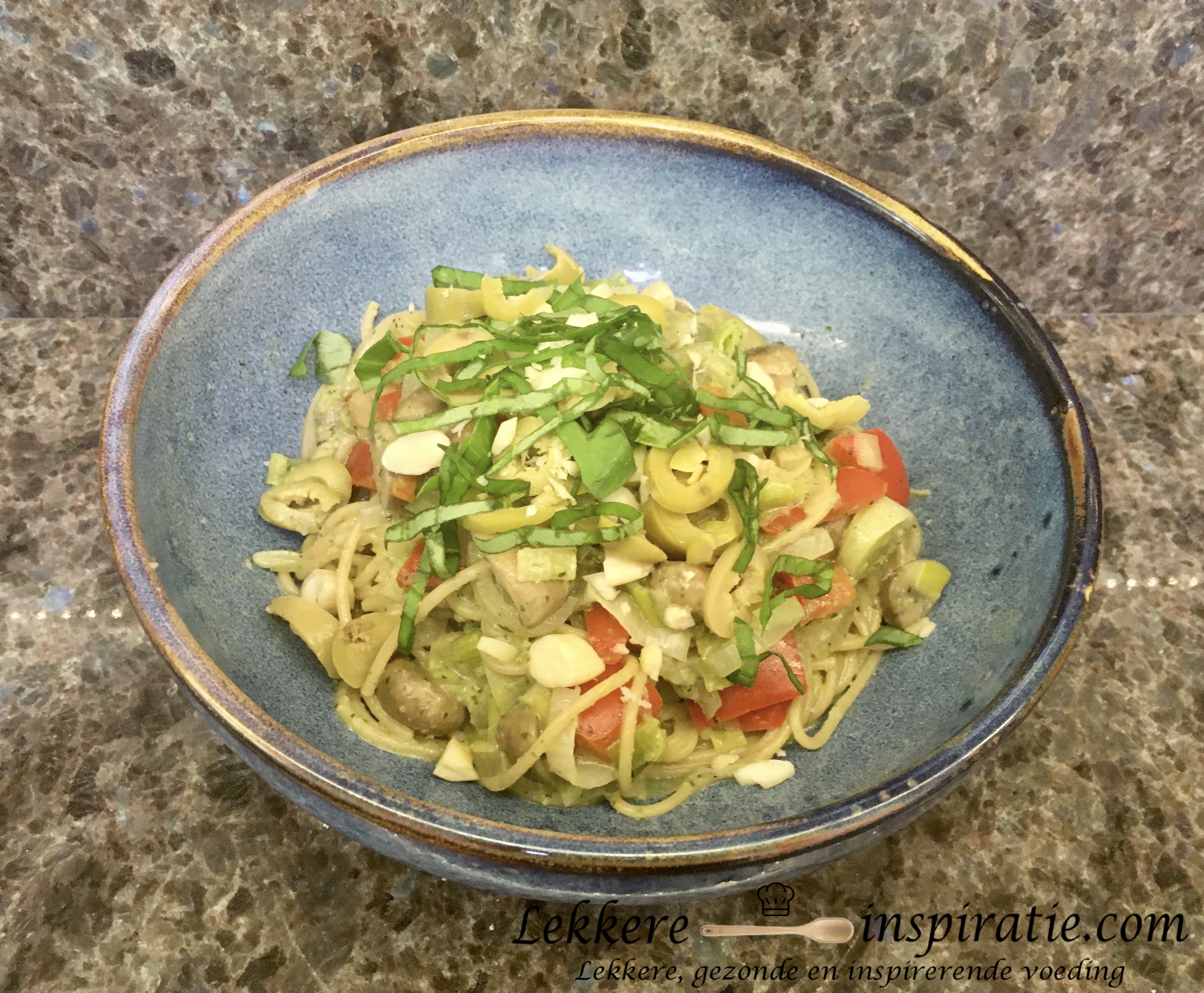 Dit recept is geïnspireerd op pasta pesto. Maar deze versie zit boordevol groenten en smaak. Het is niet moeilijk om te maken en je kan variëren met de groenten naar smaak en seizoen. Klik onder de foto voor o.a. het recept…