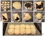 - Verdeel het deeg na het rijzen in 10 (gelijke) stukken (van ±80-100g ). Maak 5 deegbroodjes met rozijnen en 5 met suiker. Volg hiervoor onderstaande werkwijze (zie onderaan voor grotere afbeelding):