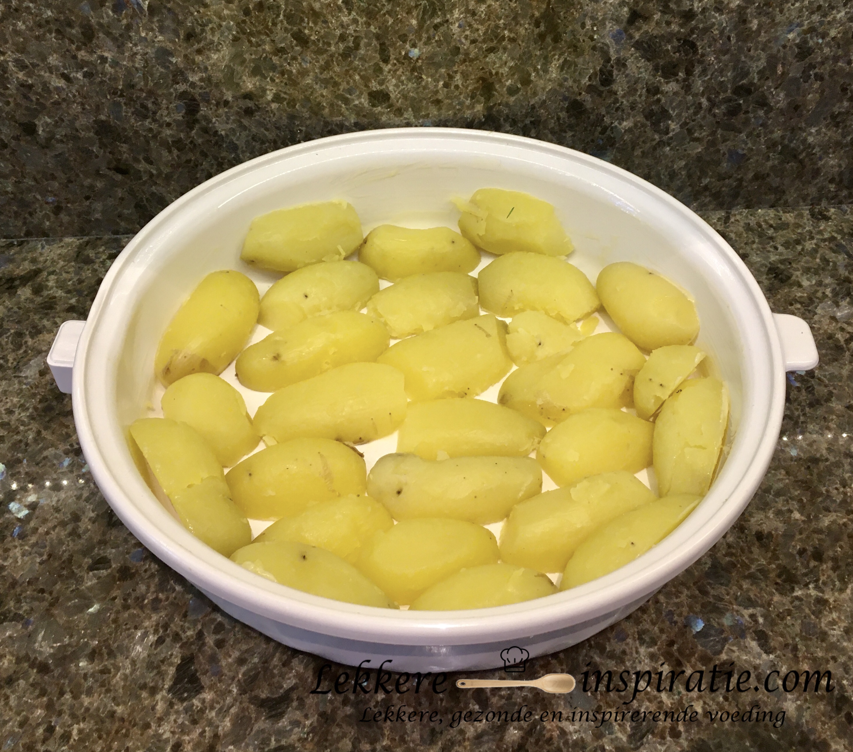- Leg de stukken aardappel in de ovenschaal.