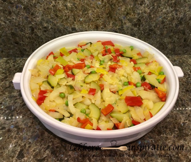 - Schep bovenop de aardappelen de groenten.