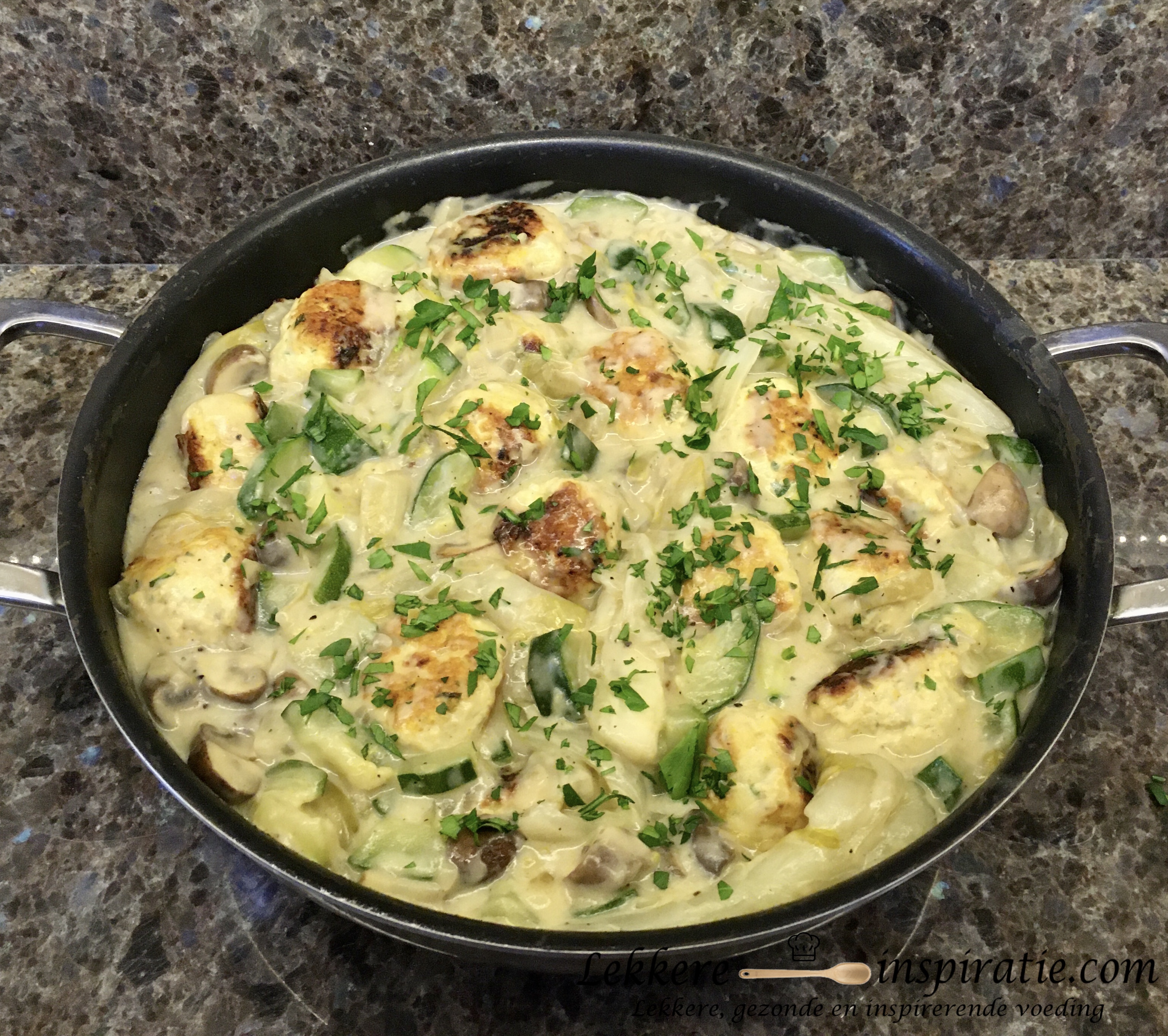 - Voeg de kippenballetjes toe en zet nog even op een zacht vuurtje tot de groenten en de kippenballetjes gaar zijn.