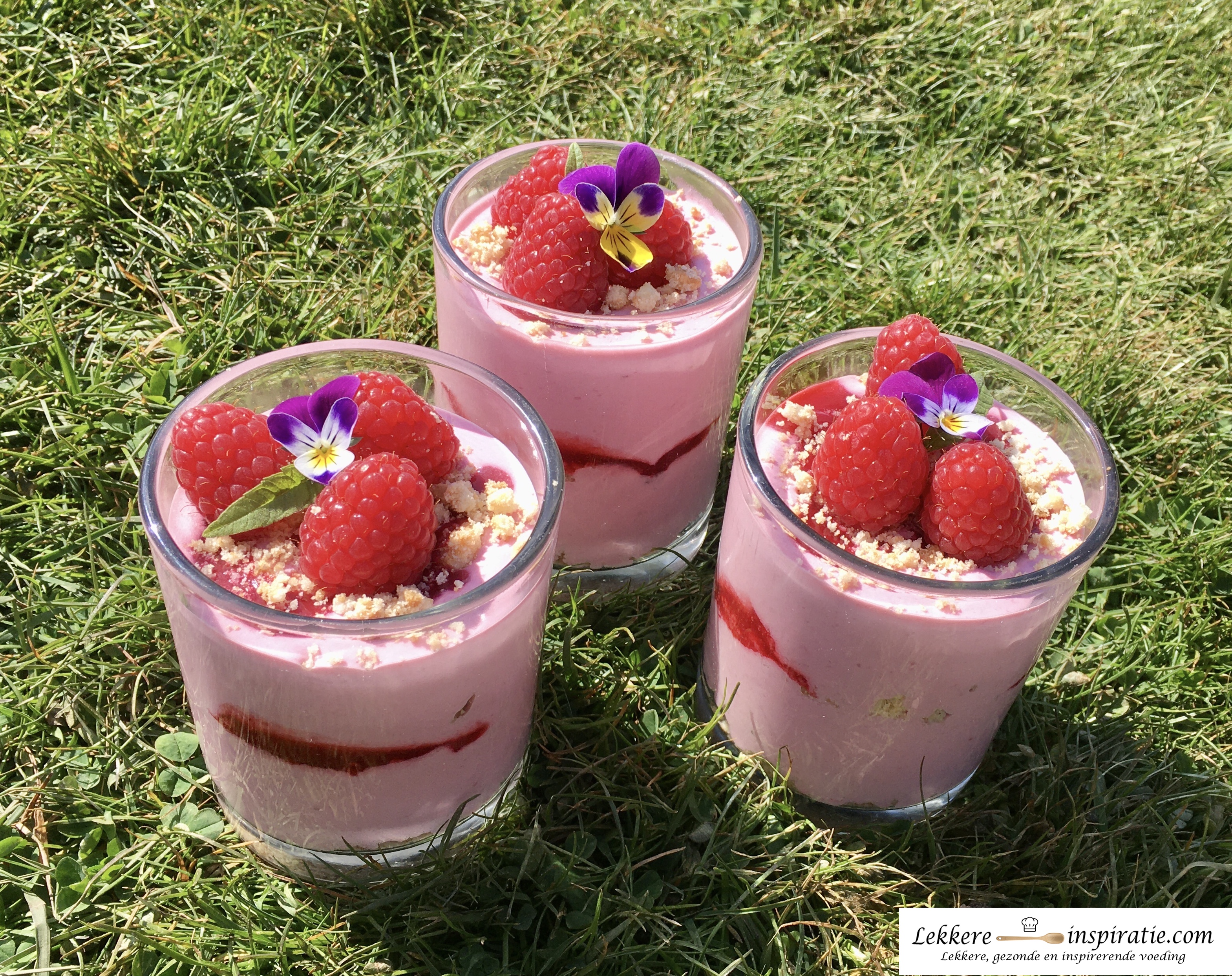 - Werk af met enkele verse frambozen en eventueel eetbare bloemen, kruiden,… en serveer.