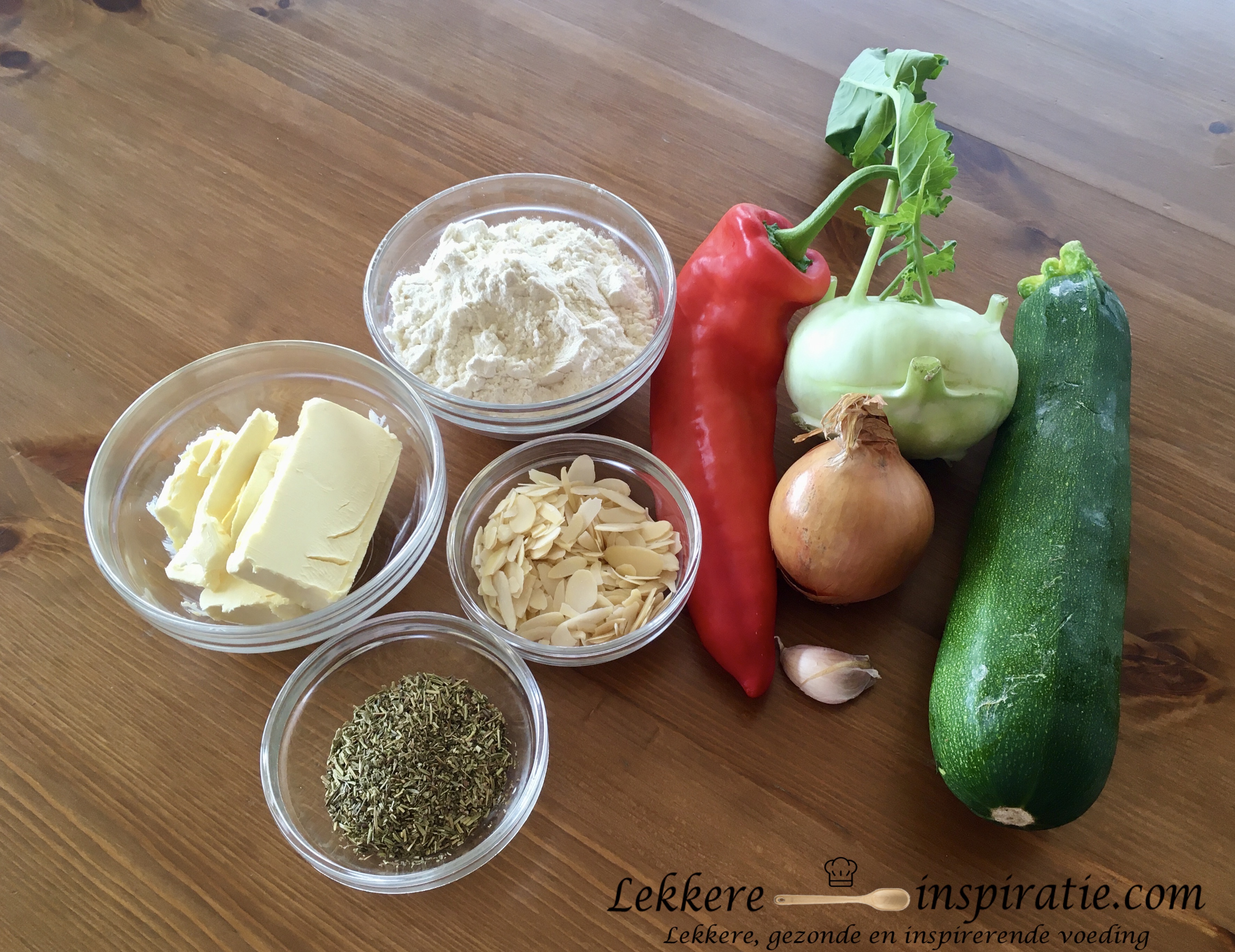- Kneed voor de crumble de bloem met de vetstof tot een deeg. Voeg de amandelschilfers en kruiden naar smaak toe en meng. Tip; zorg dat je voldoende kruiden toevoegt dit zorgt voor een lekkere kruidige crumble.