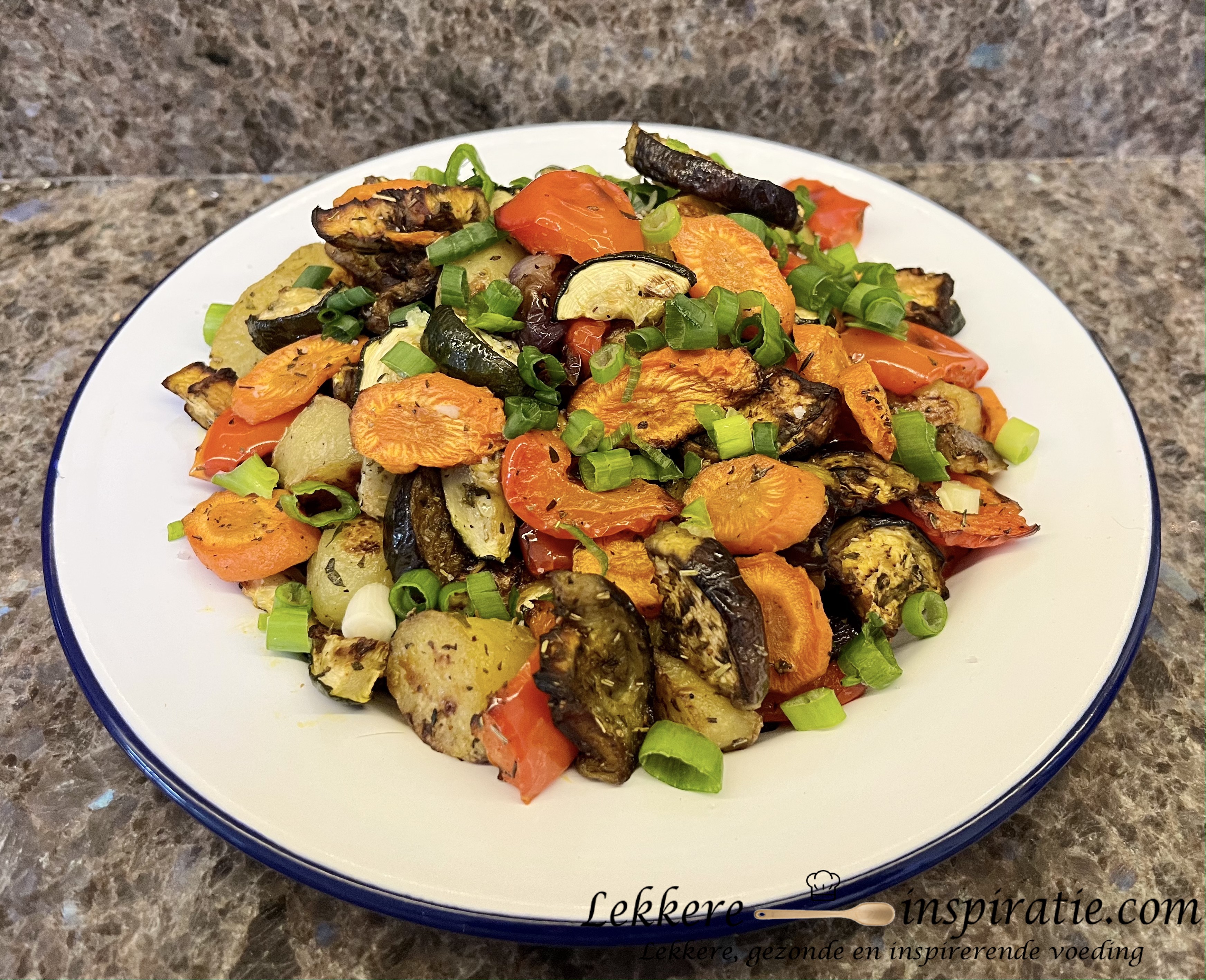 - De baktijd en de oventemperatuur kunnen verschillen van oven tot oven. Dus als het wat te hard begint te kleuren (en nog niet gaar is) verlaag de oventemperatuur en als het niet kleurt (of niet snel genoeg) dan verhoog je de temperatuur. De gaartijd hangt natuurlijk ook af van de grootte van de stukken groenten. (elke oven is verschillend)