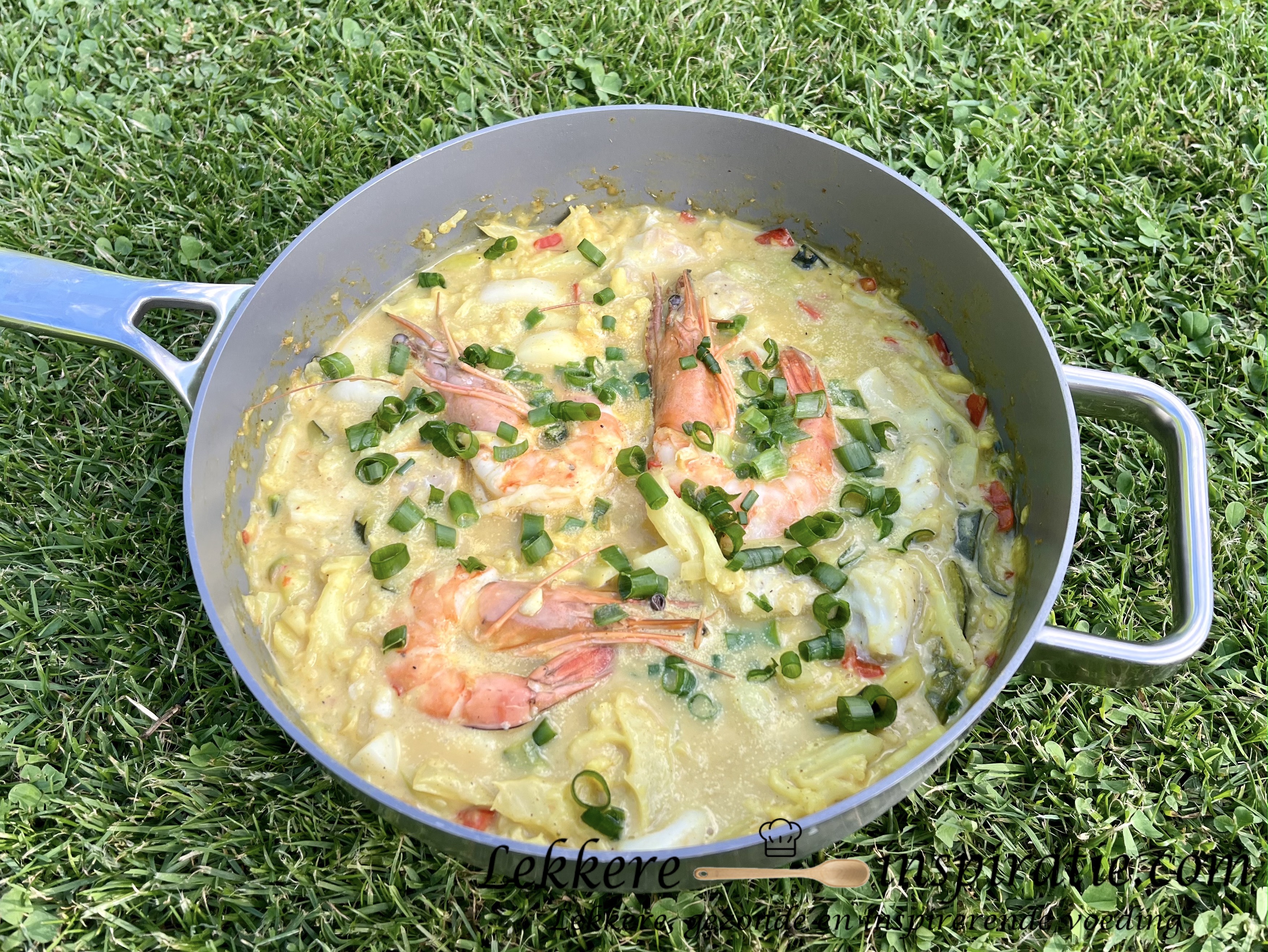 - Leg de stukken vis en zeevruchten mee in de pan, roer voorzichtig. Leg de scampi’s of gamba’s erop en duw deze een beetje in de saus. Zet een deksel op de pan en laat de vis garen (± 5 minuten). Draai de gamba’s/ scampi’s halverwege om zodat ze mooi roze kleuren.