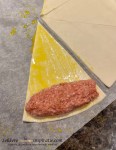 - Maak 8 dikke worstjes van het gehakt (± 6-8cm lang, ongeveer zo lang als de bladerdeeg-punt aan de breedste kant).