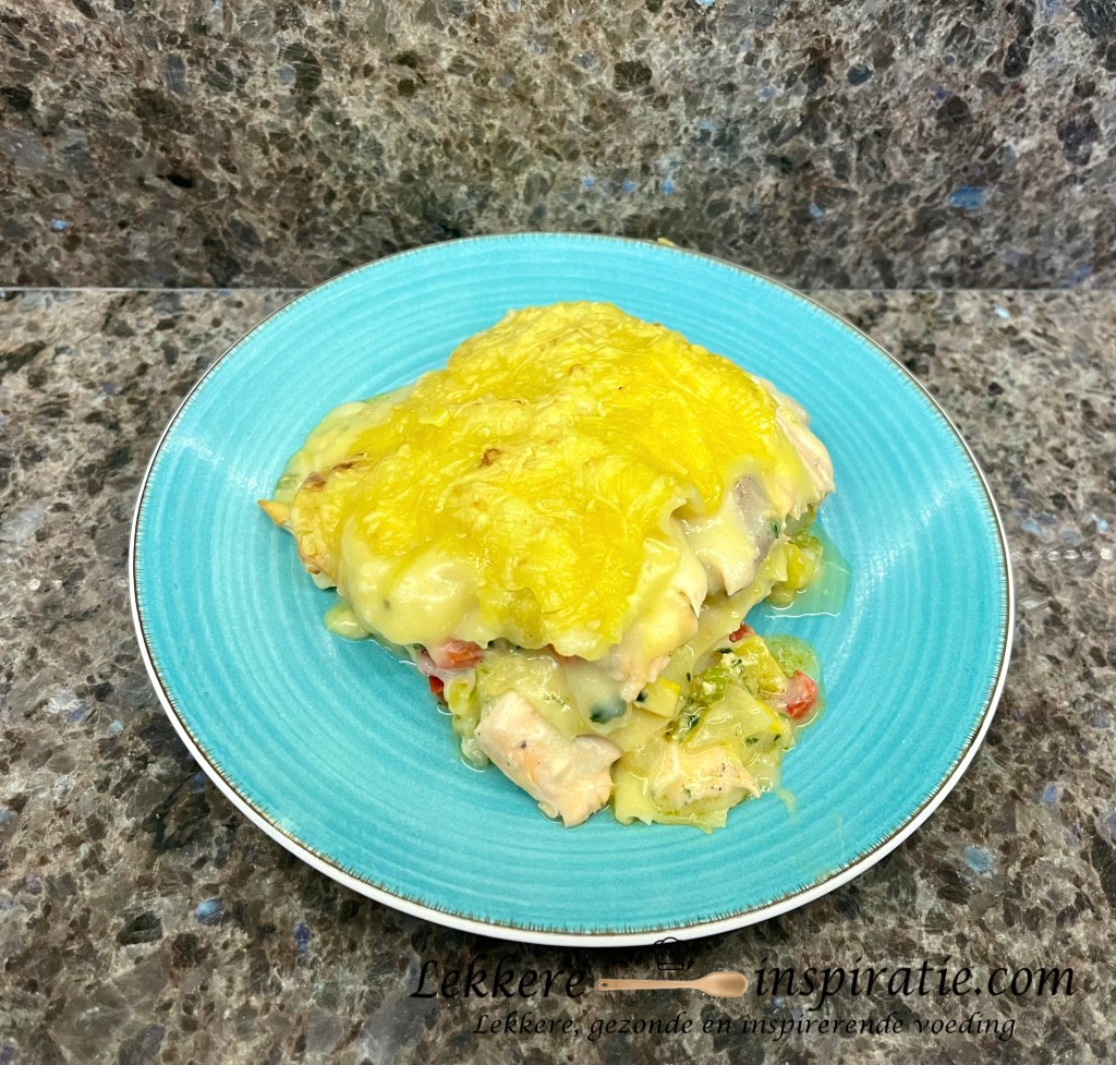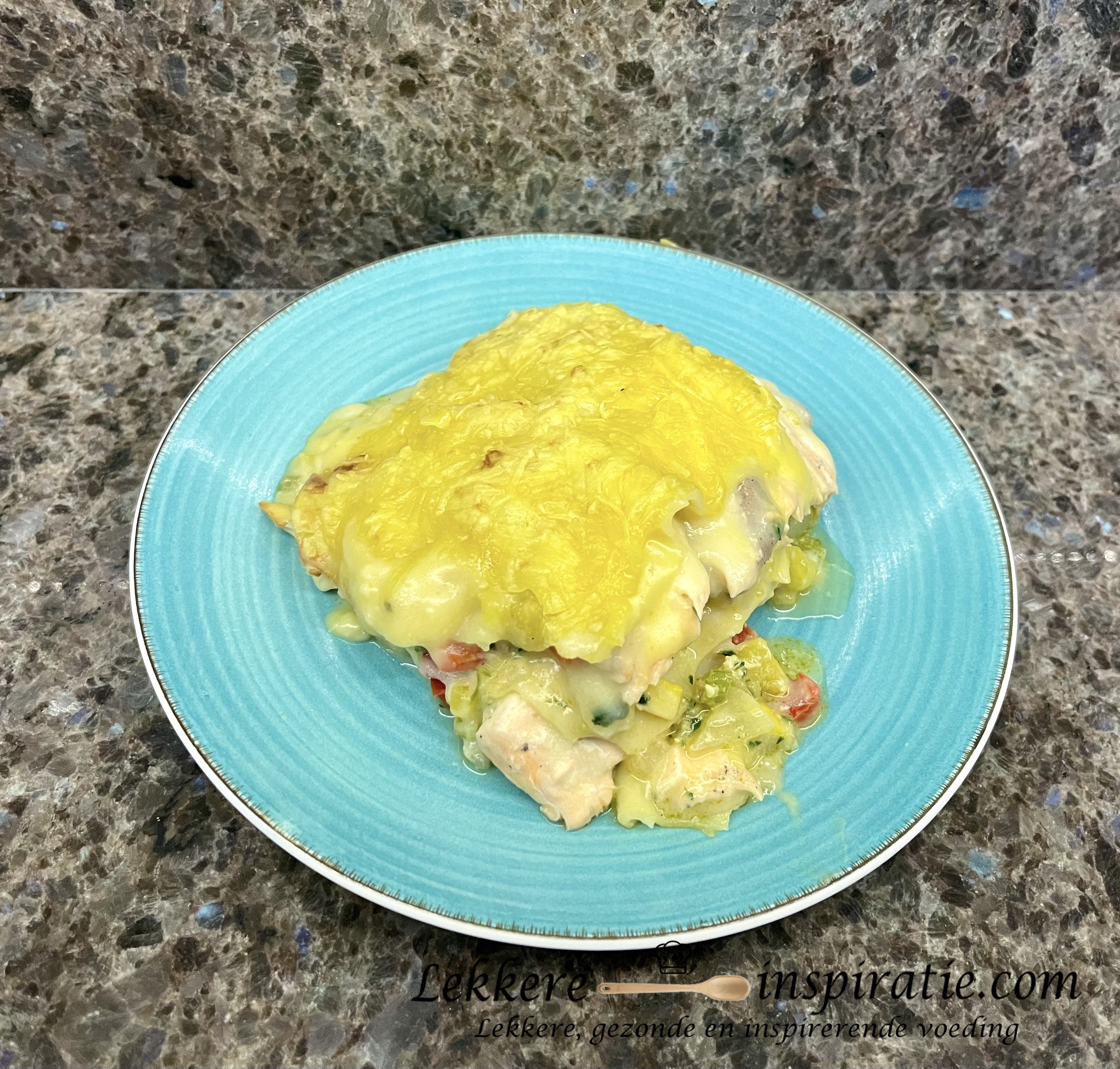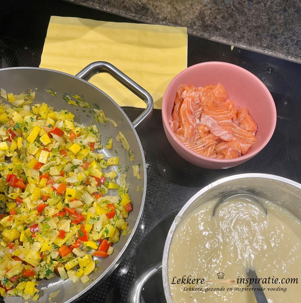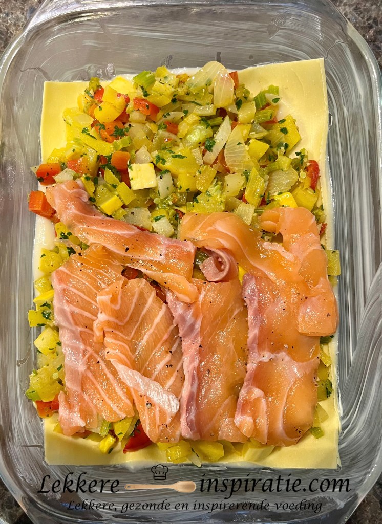 - Leg hierop een lasagne vel. Doe hierop een deel van de gestoofde groenten, leg de plakjes vis erop.