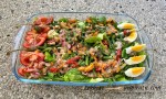 - Doe de boontjes en radijsjes erbij. Werk verder af met de tomaatjes en partjes ei.