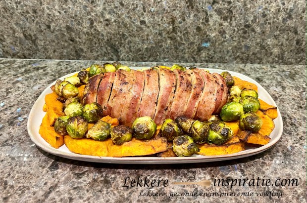 Gehaktbrood met spek, pompoen en spruitjes uit de oven