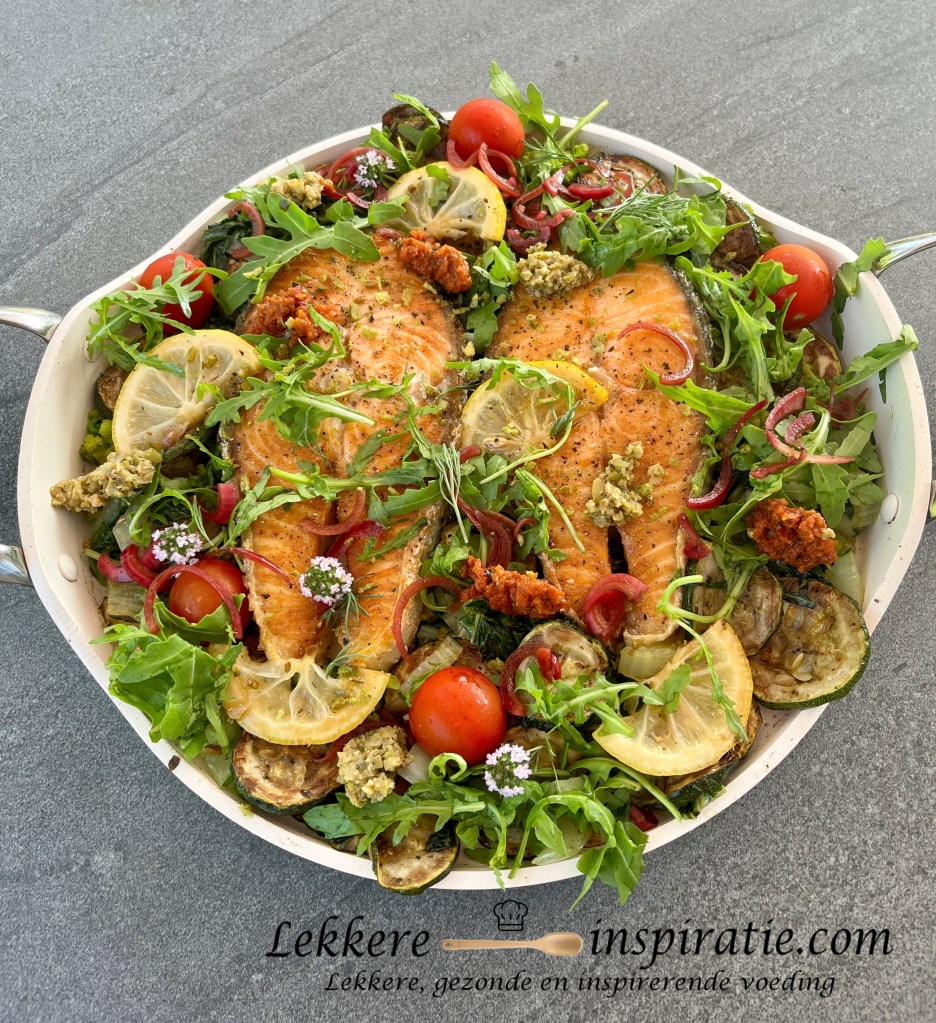 Een kleurrijke, lauwwarme maaltijd met gebakken zalm, frisse rucola, zomergroenten en pesto. Serveer bijvoorbeeld met een stukje (stok)brood, (gebakken) aardappelen, pasta,…. Klik onder de foto voor o.a. het recept….