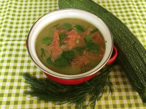 Courgettesoep afgewerkt met zalm, dille, waterkers en lent-ui